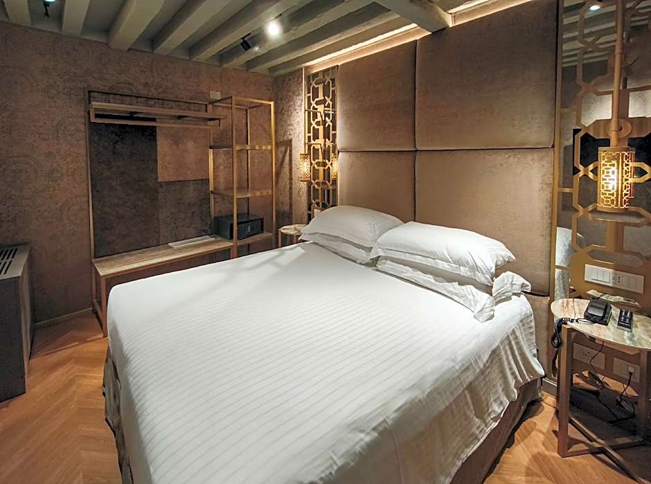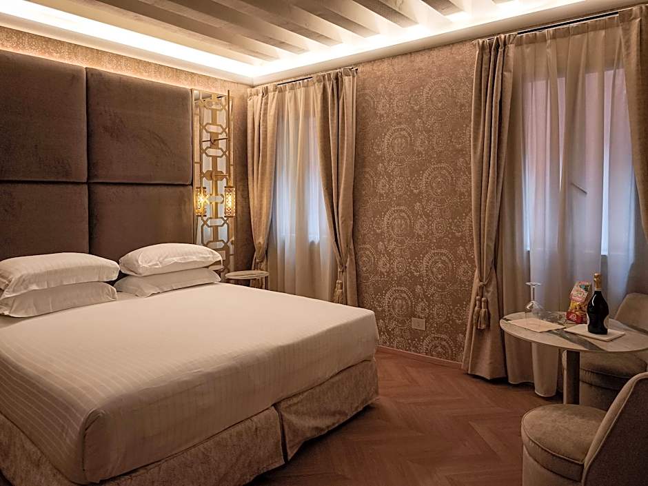 Elegant Venetian style room with all modern comforts, enriched by Murano glass chandeliers and appliques. The view is on the characteristic streets of Venice. The bathroom is in Venetian marble.